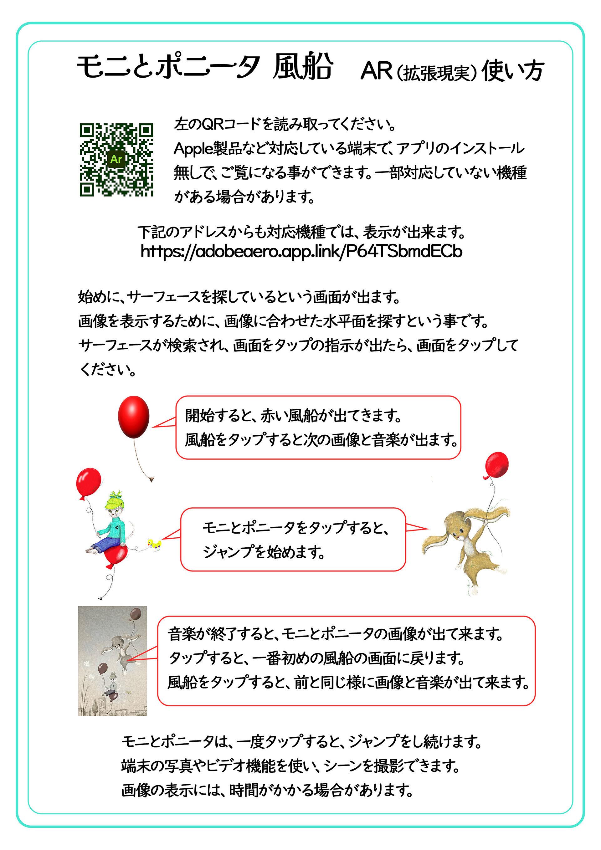 Adobe Aeroのサービスの提供が終了したため、こちらのAR(拡張現実)の作品は体験していただく事が出来なくなりました。ホームページの"Moni and Ponyta Ballon ARversion"(下記のボタン)のページの方に、こちらの作品のビデオが掲載してあります。そちらをご覧いただけたらと思います。